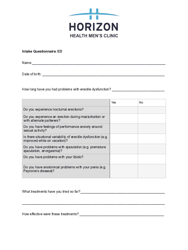 Intake Questionnaire: ED Name:___ Date of birth: ___How long have you had problems with erectile dysfunction? ___YesNoDo you experience nocturnal erections? Do you experience an erection during masturbation