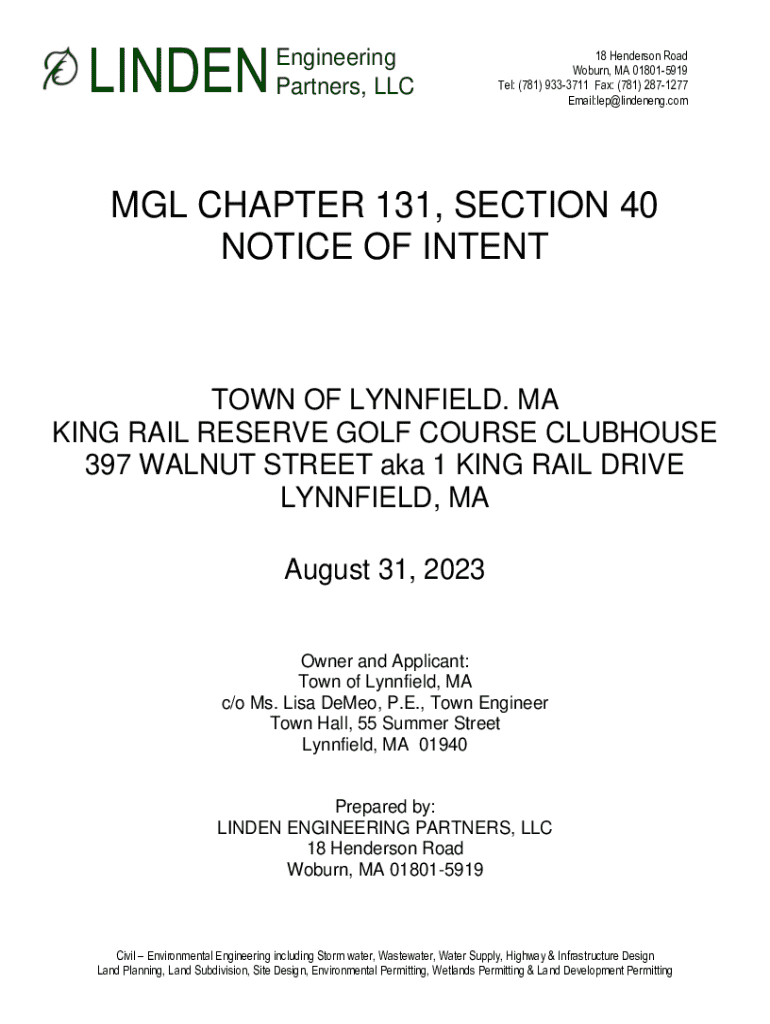 This Notice of Intent details the construction of a golf clubhouse and site improvements at King Rail Reserve Golf Course, ensuring compliance with Massachusetts Wetlands Protection Act.
