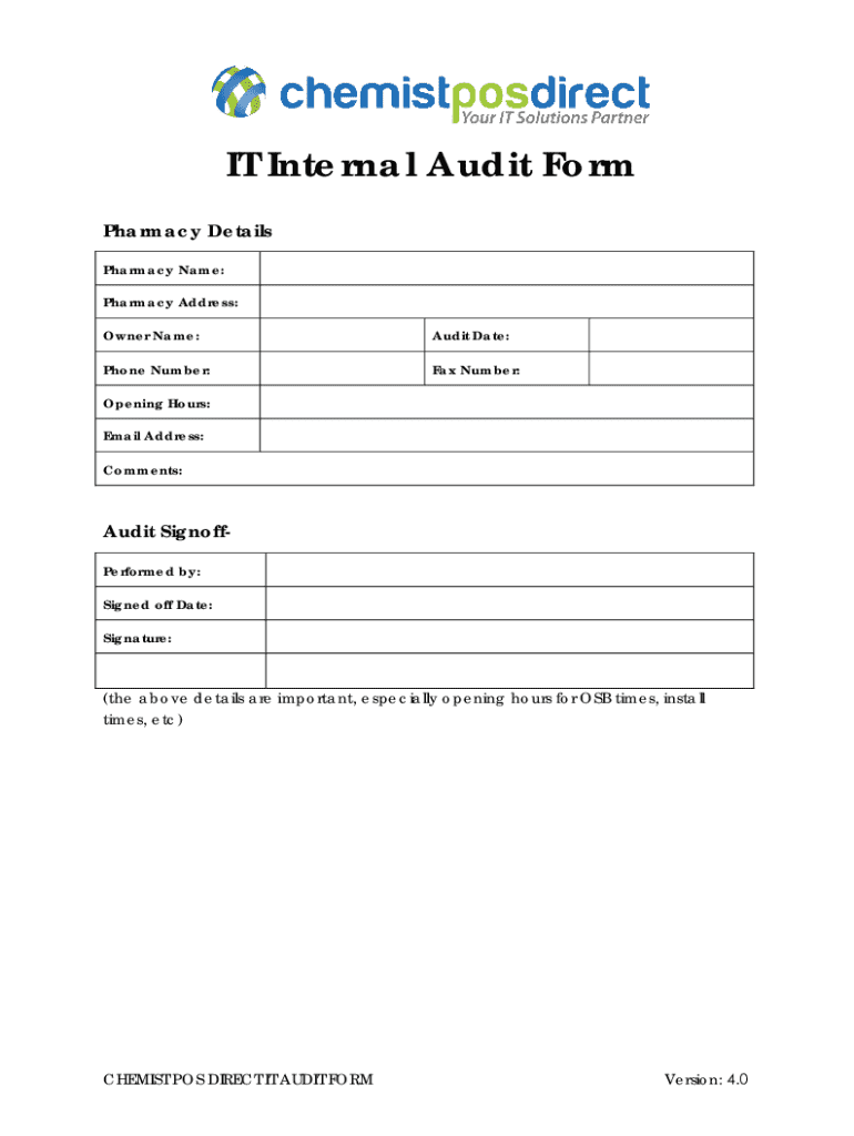 IT Internal Audit Form Pharmacy Details Pharmacy Name: Pharmacy Address: Owner Name:Audit Date:Phone Number:Fax Number:Opening Hours: Email Address: Comments:Audit SignoffPerformed by: Signed off