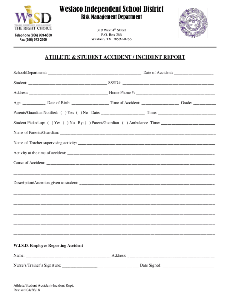Weslaco Independent School District Risk Management Department Telephone (956) 9696530 Fax (956) 9732500319 West 4th Street P.O. Box 266 Weslaco, TX 785990266ATHLETE & STUDENT ACCIDENT / INCIDENT