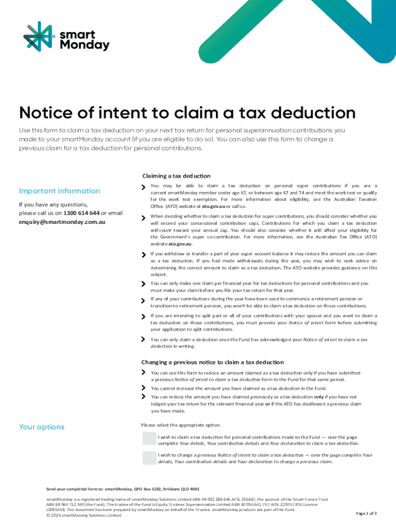 Notice of intent to claim a tax deduction Use this form to claim a tax deduction on your next tax return for personal superannuation contributions you made to your smart Monday account (if you are