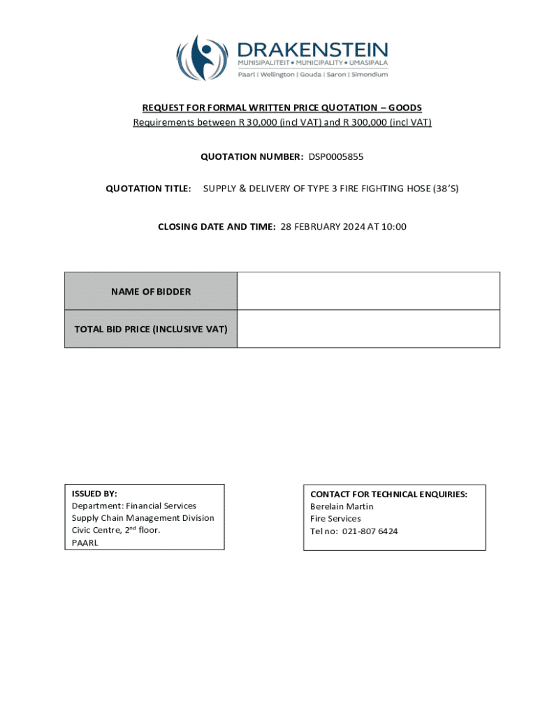 REQUEST FOR FORMAL WRITTEN PRICE QUOTATION GOODS Requirements between R 30,000 (incl VAT) and R 300,000 (incl VAT) QUOTATION NUMBER: DSP0005855 QUOTATION TITLE:SUPPLY & DELIVERY OF TYPE 3 FIRE FIGHTING