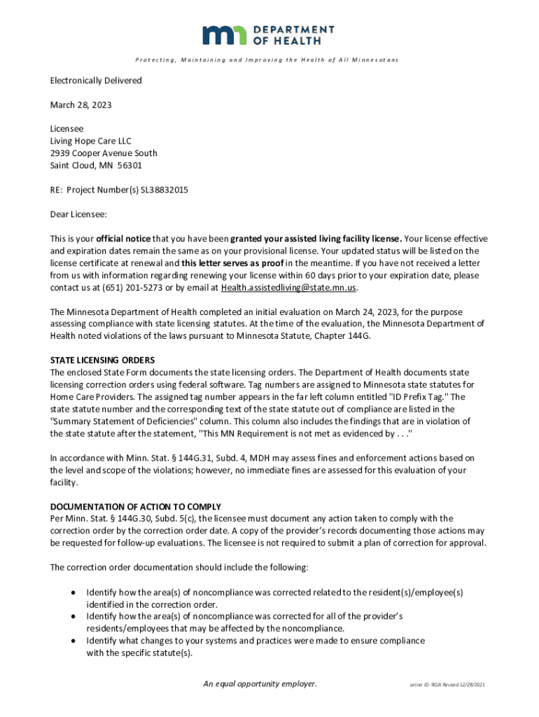 Protecting, Maintaining and Improving the Health of All MinnesotansElectronically Delivered March 28, 2023 Licensee Living Hope Care LLC 2939 Cooper Avenue South Saint Cloud, MN 56301 RE: Project