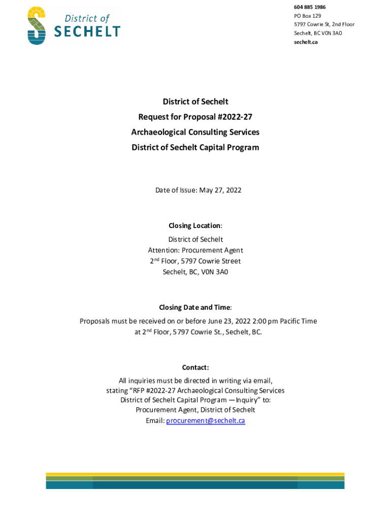 The District of Sechelt invites proposals for archaeological consulting services to support its capital program for a three-year term, with a closing date of June 23, 2022.