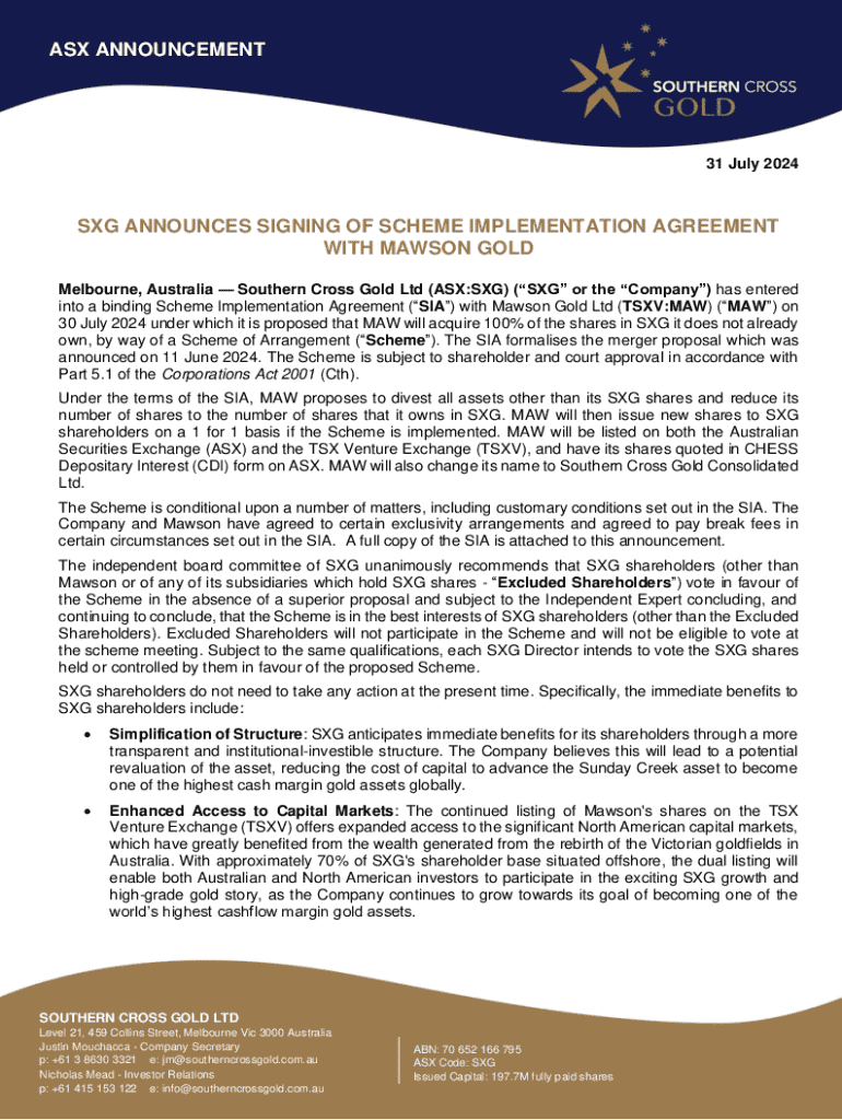 ASX ANNOUNCEMENT31 July 2024SXG ANNOUNCES SIGNING OF SCHEME IMPLEMENTATION AGREEMENT WITH MASON GOLD Melbourne, Australia Southern Cross Gold Ltd (ASX:SG) (SG or the Company) has entered into a binding