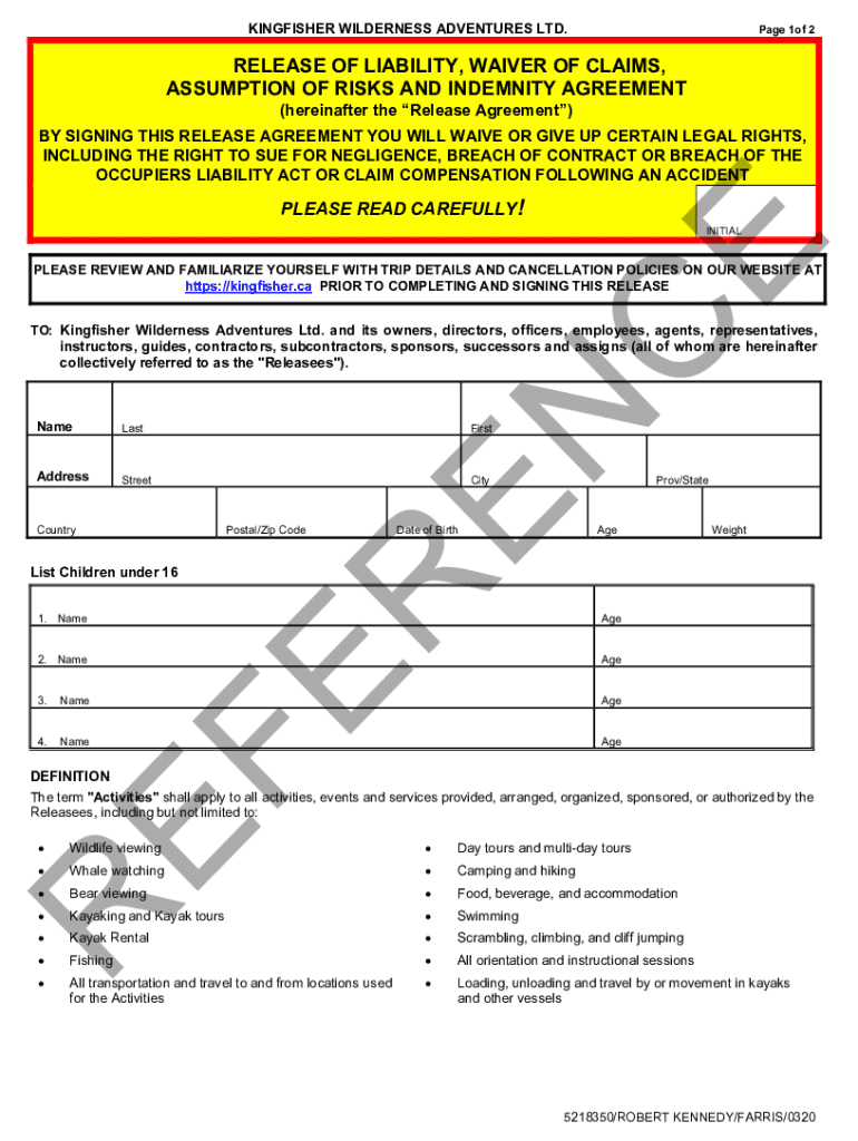 KINGFISHER WILDERNESS ADVENTURES LTD. Page 1of 2RELEASE OF LIABILITY, WAIVER OF CLAIMS,