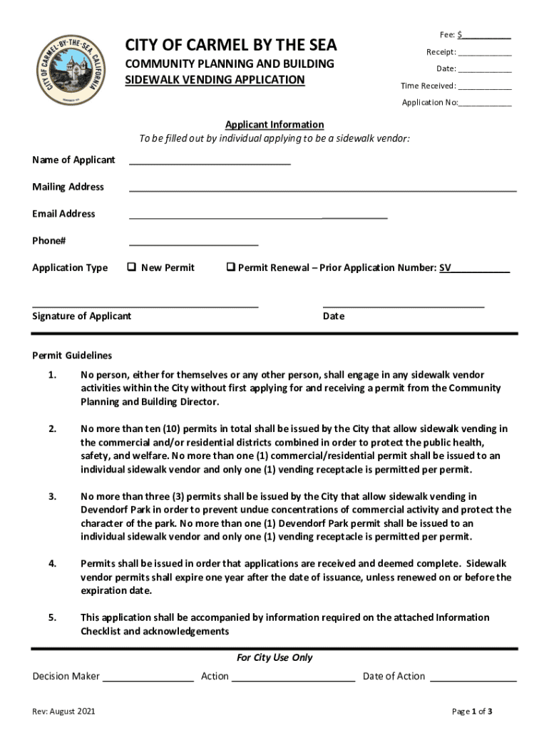 Apply for a sidewalk vending permit in Carmel by the Sea. Follow guidelines, submit required documents, and ensure compliance with local regulations.