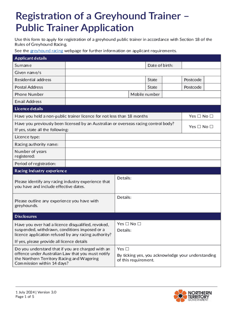 Apply for registration as a greyhound public trainer in compliance with Section 18 of the Rules of Greyhound Racing. Ensure your application meets all requirements.