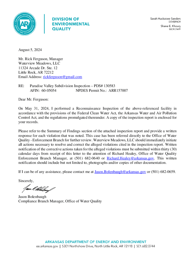 August 5, 2024, Mr. Rick Ferguson, Manager Water view Meadows, LLC 11324 Arcade Dr. Ste. 12 Little Rock, AR 72212 Email Address: rickferguson@gmail.com RE:Paradise Valley Subdivision Inspection PDS#