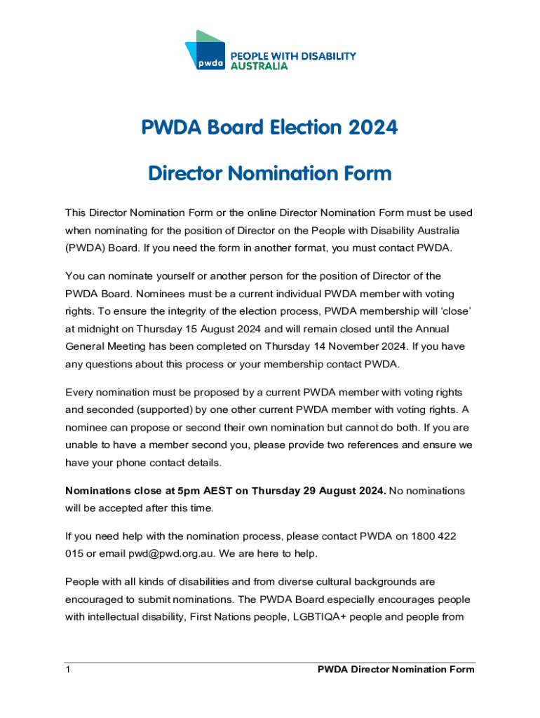 PWDA Board Election 2024 Director Nomination Form This Director Nomination Form or the online Director Nomination Form must be used when nominating for the position of Director on the People with