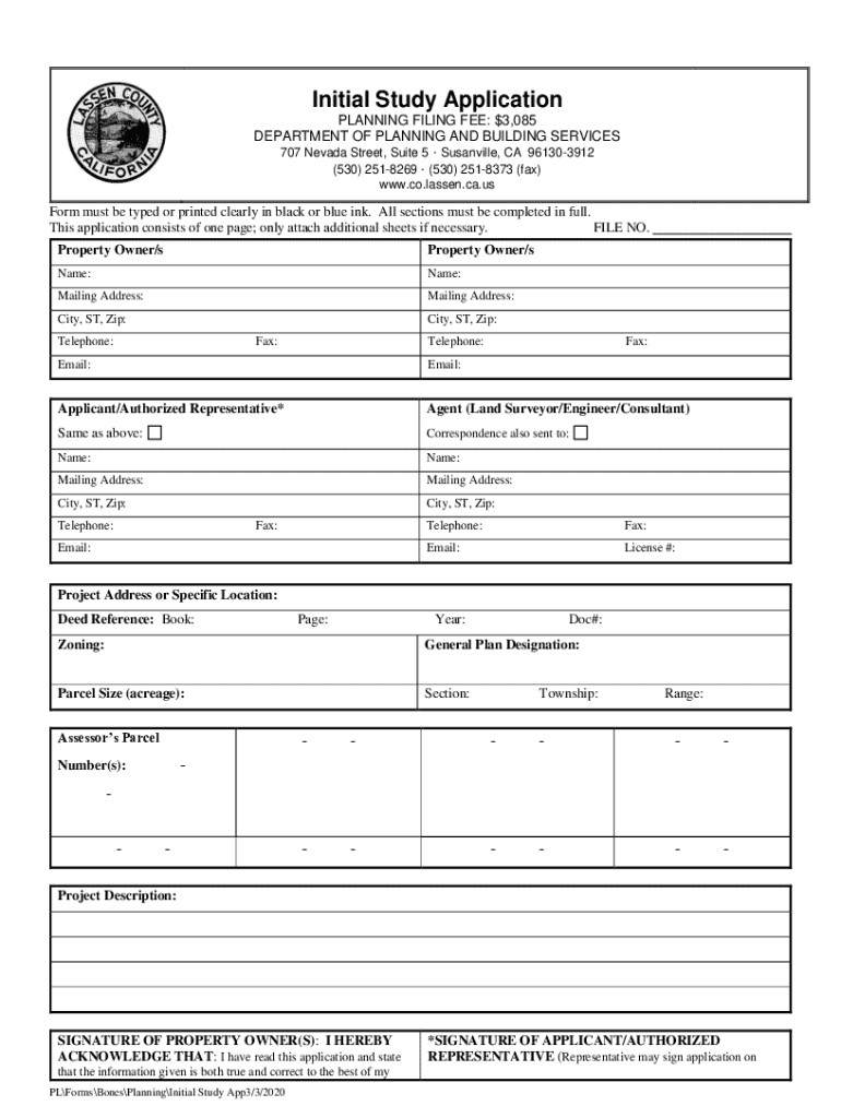 Initial Study Application PLANNING FILING FEE: $3,085 DEPARTMENT OF PLANNING AND BUILDING SERVICES 707 Nevada Street, Suite 5 Susanville, CA 961303912 (530) 2518269 (530) 2518373 (fax) www.co.lassen.ca.usForm
