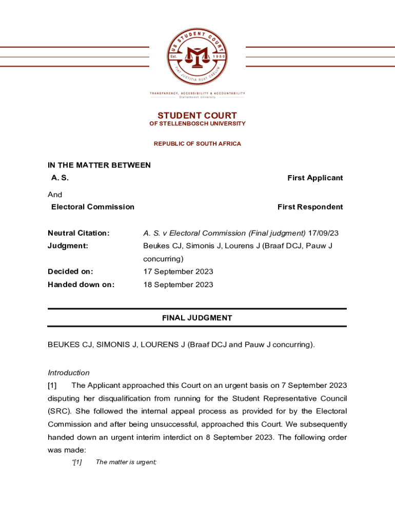 This document discusses the final judgment regarding the disqualification of A. S. from the Student Representative Council elections at Stellenbosch University. It addresses procedural fairness, irregularities, and the lawfulness of the Commission\'s actions.