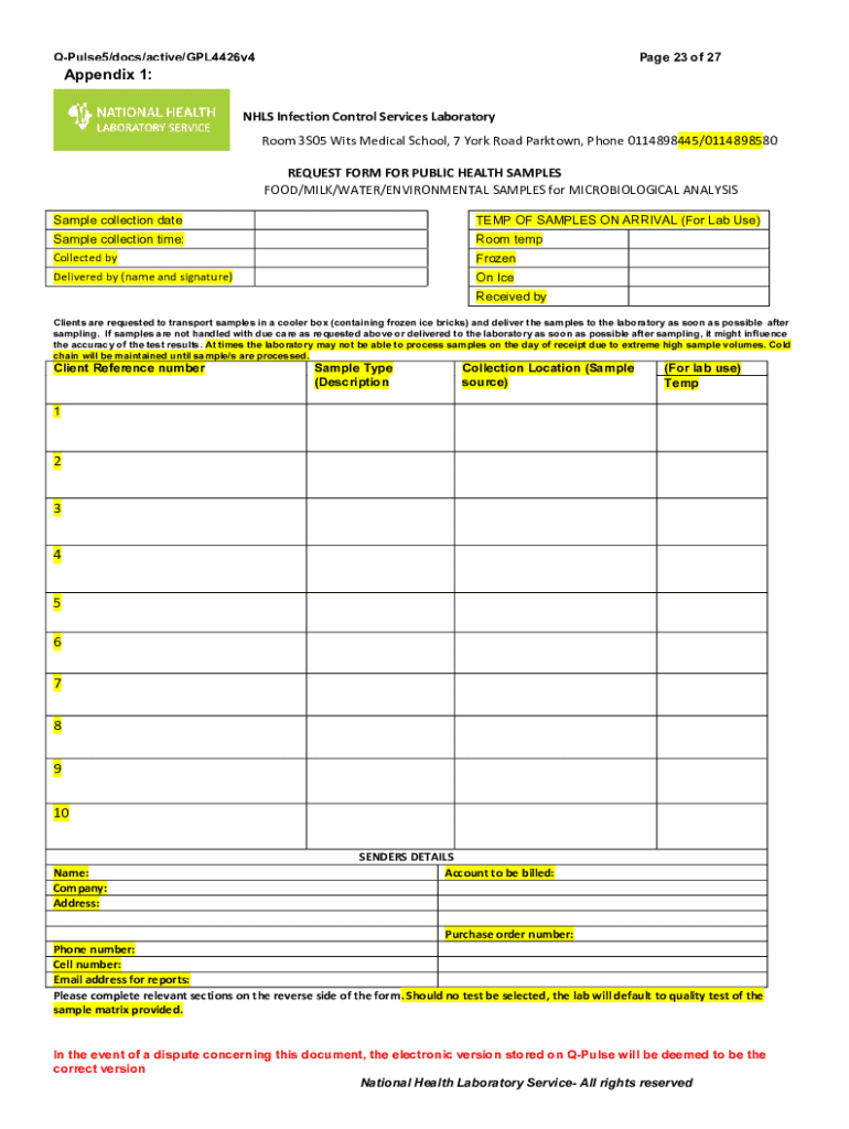 This form facilitates the collection and analysis of food, water, and environmental samples for microbiological testing. Ensure proper sample handling to maintain accuracy.