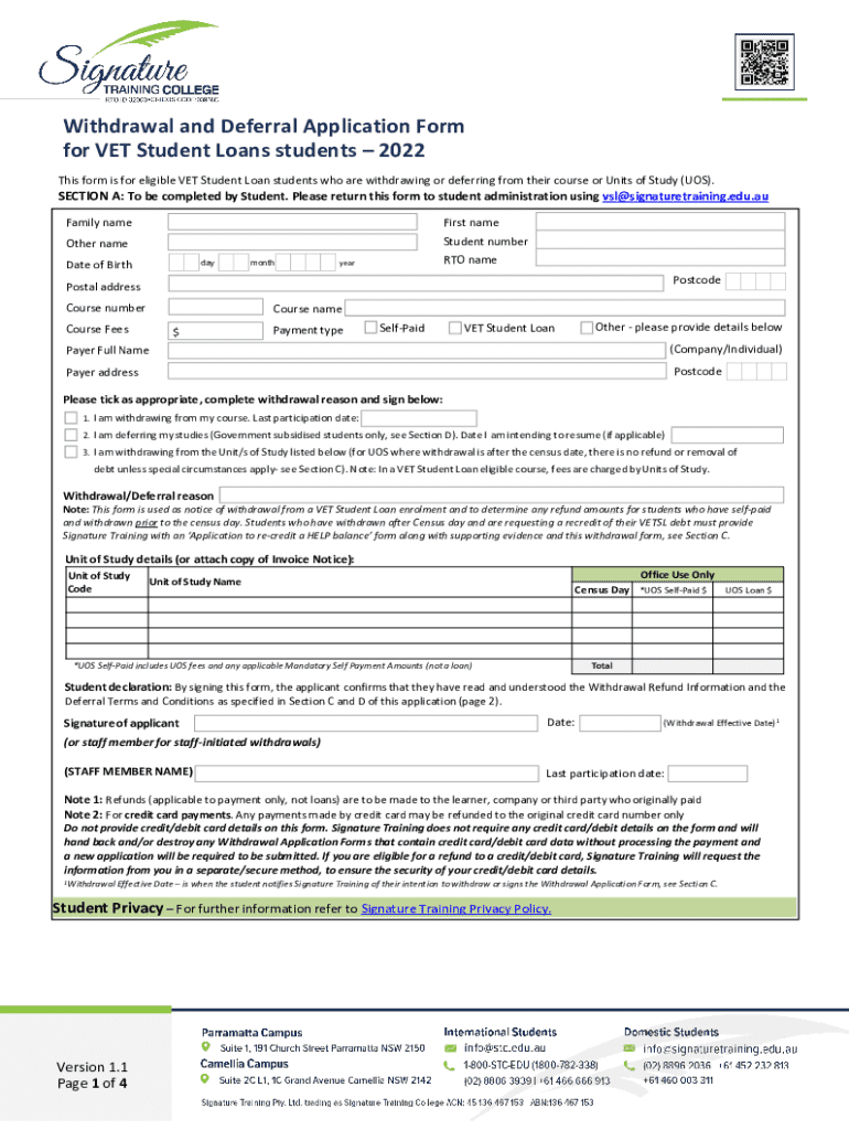 Get the free Withdrawal and Deferral Application Form for VET Student Loans ...
