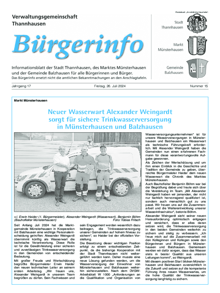 Postaktuell: An slice Nauseate. Jahrgang 17Freitag, 26. July 2024Nummer 15Markt MnsterhausenNeuer Wassermann Alexander Reinhardt