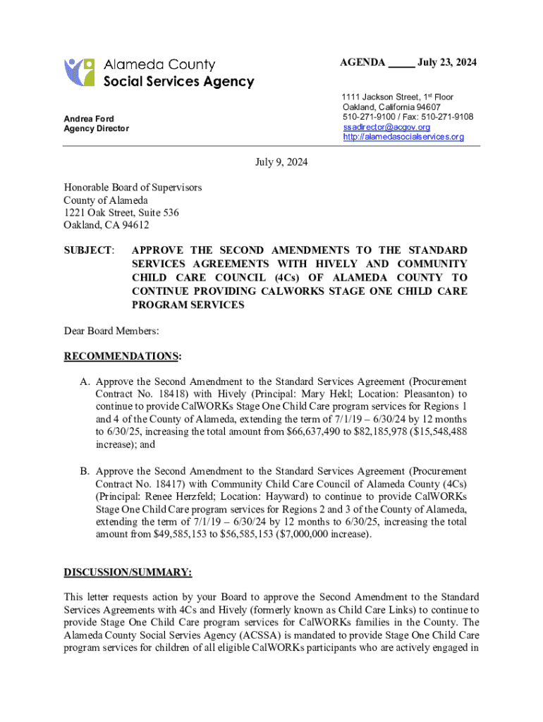 AGENDA ___ July 23, 2024 1111 Jackson Street, 1st Floor Oakland, California 94607 5102719100 / Fax: 5102719108 ssadirector@acgov.org http://alamedasocialservices.orgAndrea Ford Agency Director July