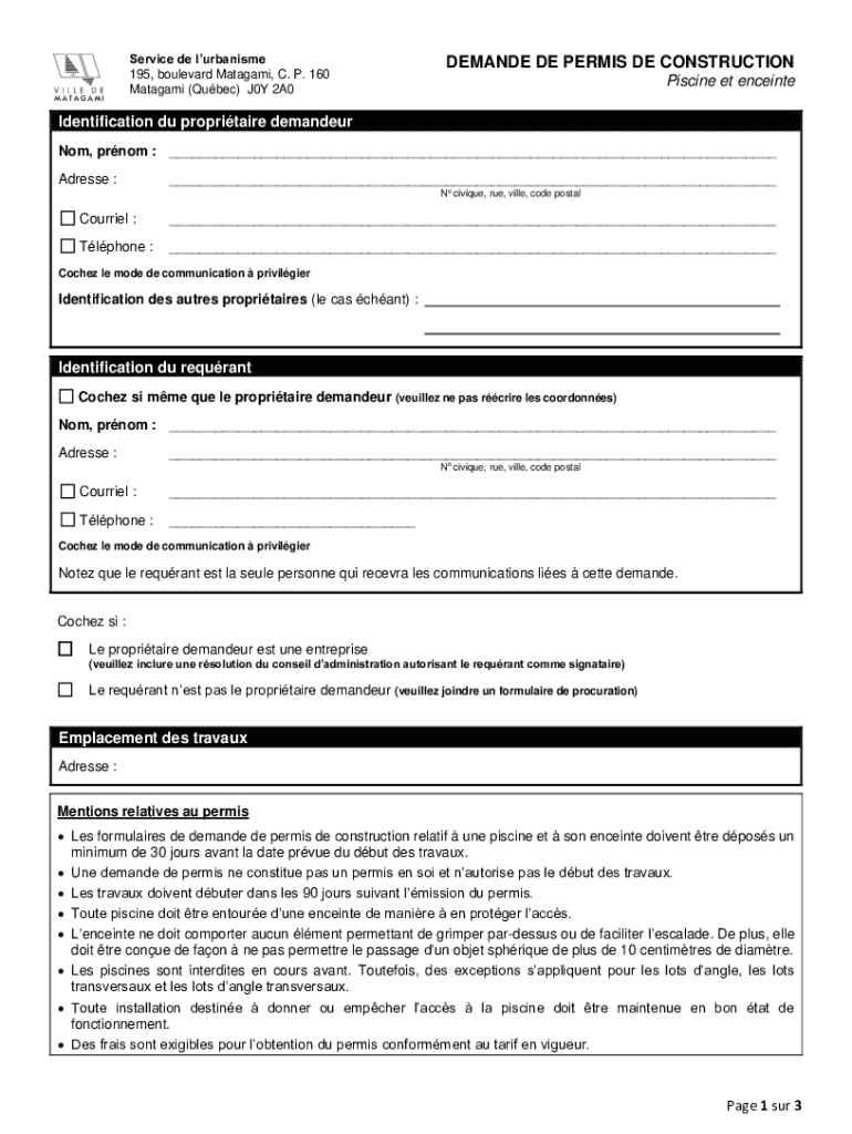 Malagasy (Quebec) J0Y 2A0DEMANDE DE PERMIT DE CONSTRUCTION