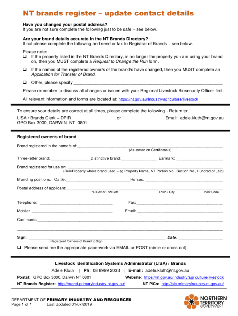 NT brands register update contact details Have you changed your postal address? If you are not sure complete the following just to be safe see below. Are your brand details accurate in the NT Brands