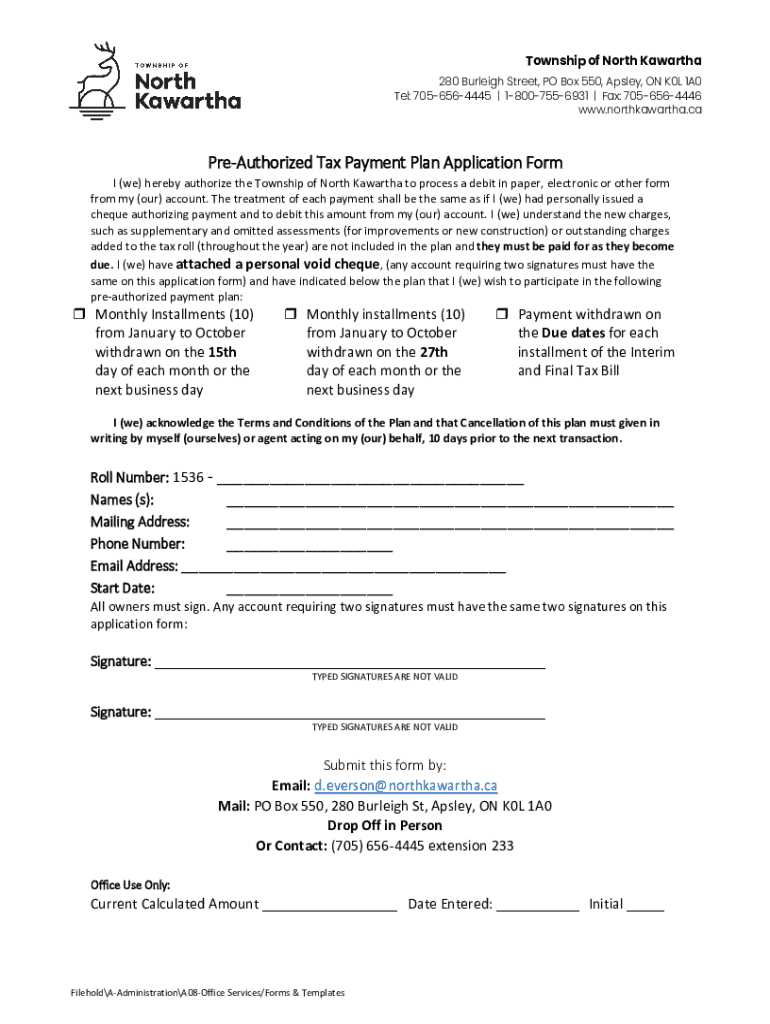Township of North Martha 280 Burleigh Street, PO Box 550, Apply, ON K0L 1A0 Tel: 7056564445 | 18007556931 | Fax: 7056564446 www.northkawartha.caPreAuthorized Tax Payment Plan Important Information