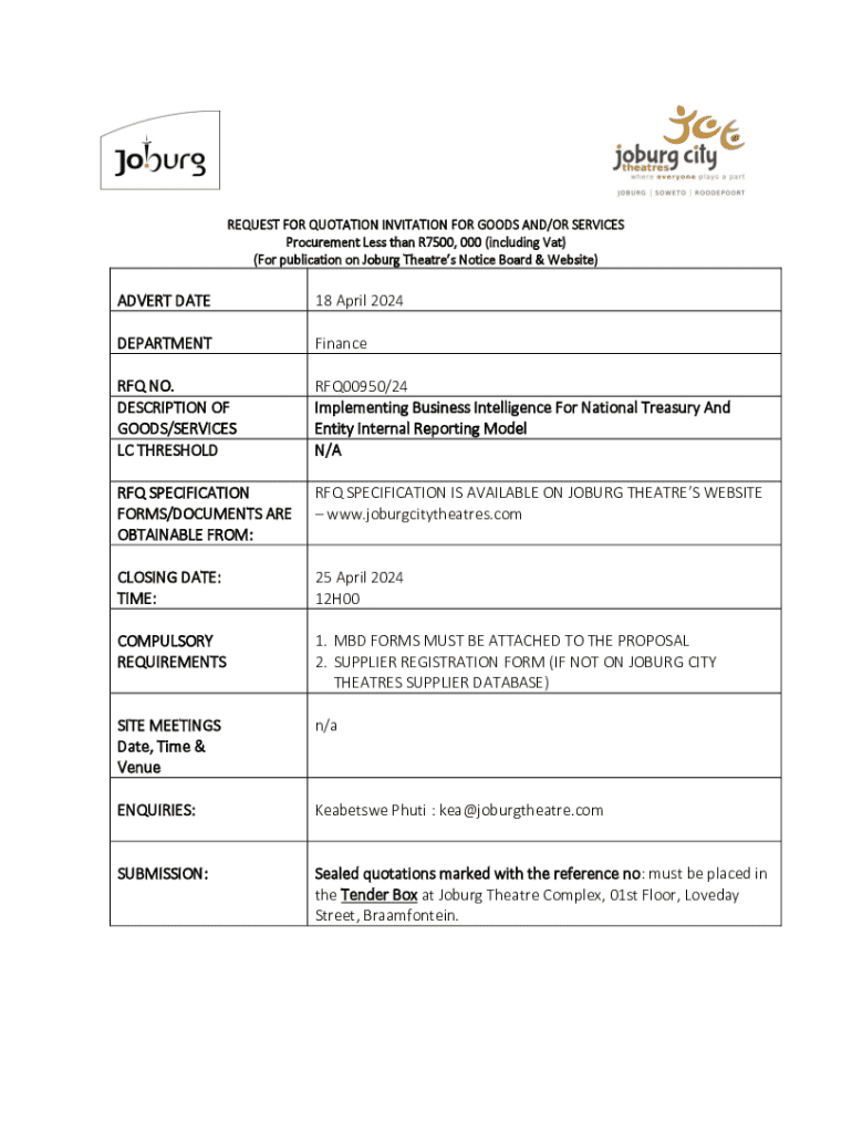 Jo burg Theater invites quotations for implementing Business Intelligence for National Treasury. Closing date: 25 April 2024. Ensure compliance with all requirements.