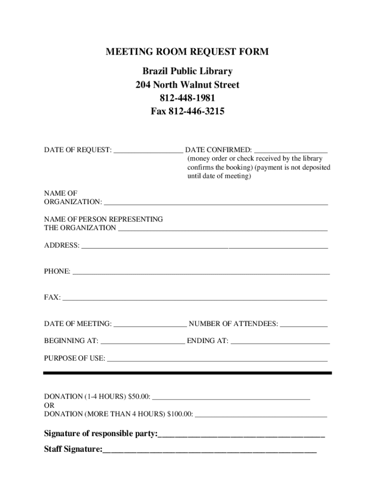 MEETING ROOM REQUEST FORM Brazil Public Library 204 North Walnut Street 8124481981 Fax 8124463215DATE OF REQUEST: ___ DATE CONFIRMED: ___ (money order or check received by the library confirms the