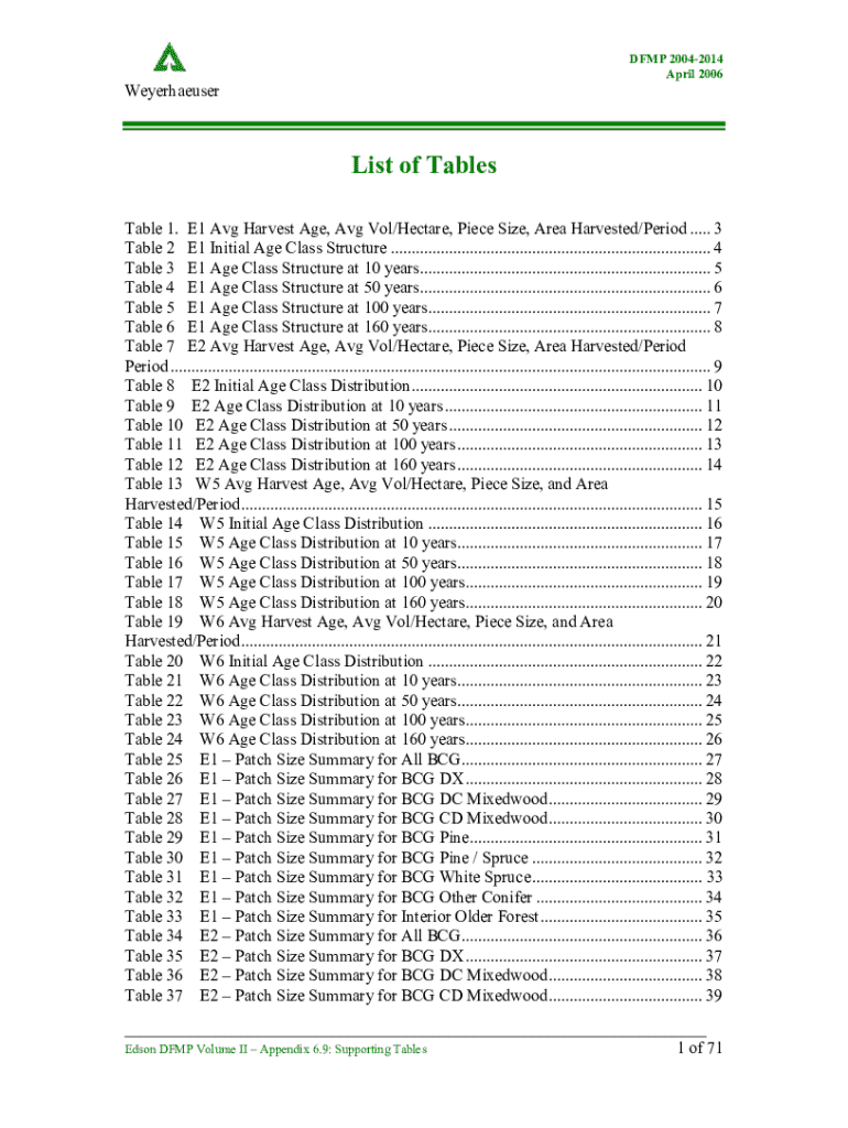 Explore the comprehensive data and tables of the DFMP 2004-2014, providing insights into age class distribution, patch size summaries, and forest management strategies.