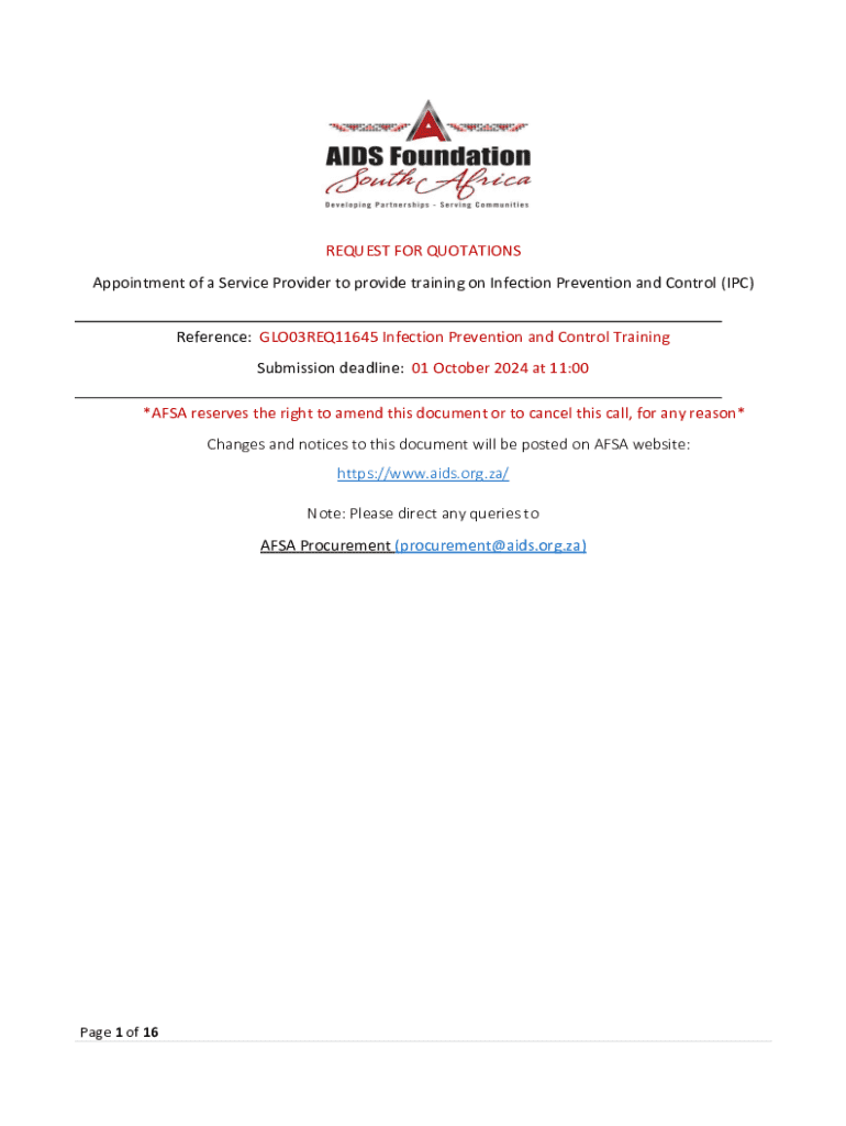 REQUEST FOR QUOTATIONS Appointment of a Service Provider to provide training on Infection Prevention and Control (IPC) Reference: GLO03REQ11645 Infection Prevention and Control Training Submission