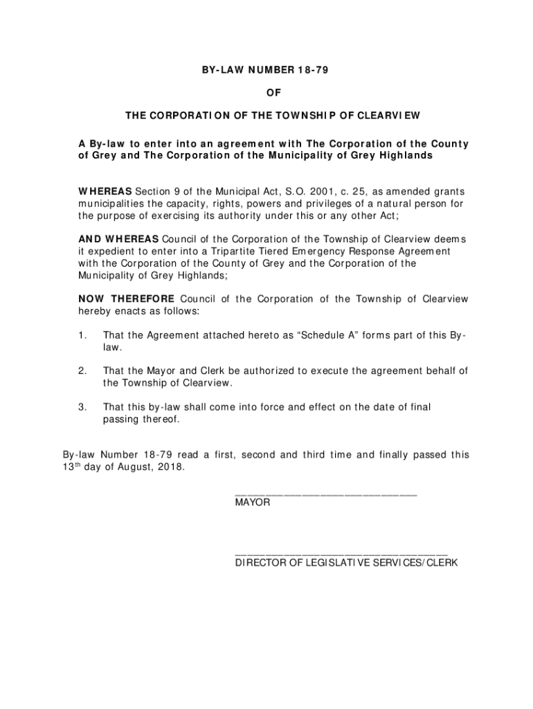 BYLAW NUMBER 1879 OF THE CORPORATION OF THE TOWNSHIP OF CLEARVIEW A Bylaw to enter into an agreement with The Corporation of the County of Grey and The Corporation of the Municipality of Grey Highlands