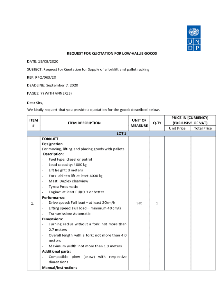 REQUEST FOR QUOTATION FOR VALUE GOODS DATE: 19/08/2020 SUBJECT: Request for Quotation for Supply of a forklift and pallet racking REF: RFQ/063/20 DEADLINE: September 7, 2020, PAGES: 7 (WITH ANNEXES)