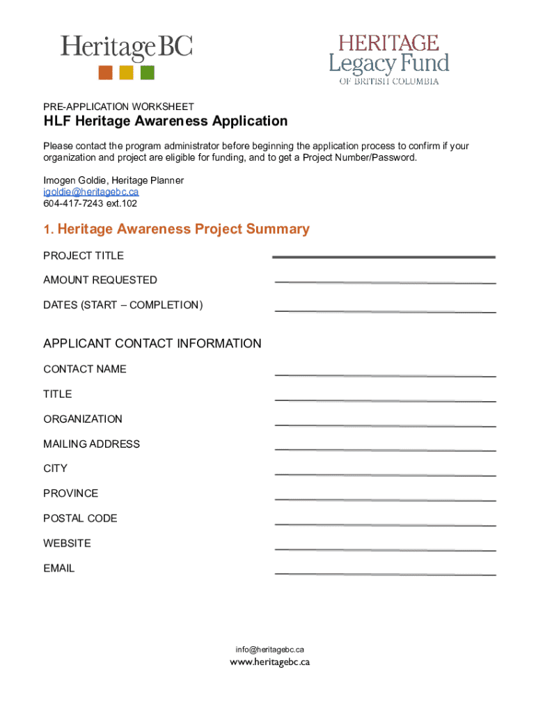 REAPPLICATION WORKSHEET Heritage Awareness Application Please contact the program administrator before beginning the application process to confirm if your organization and project are eligible for