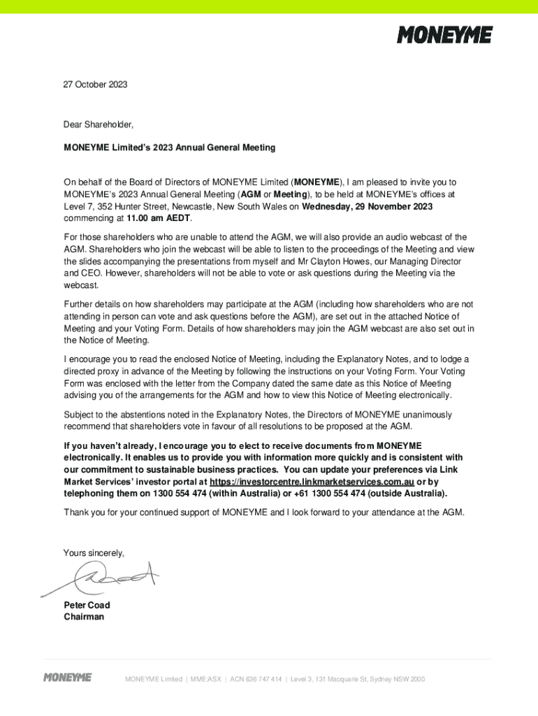 Join MONEY ME Limited for the 2023 AGM on 29 November 2023, featuring key resolutions and an exclusive webcast for shareholders unable to attend.