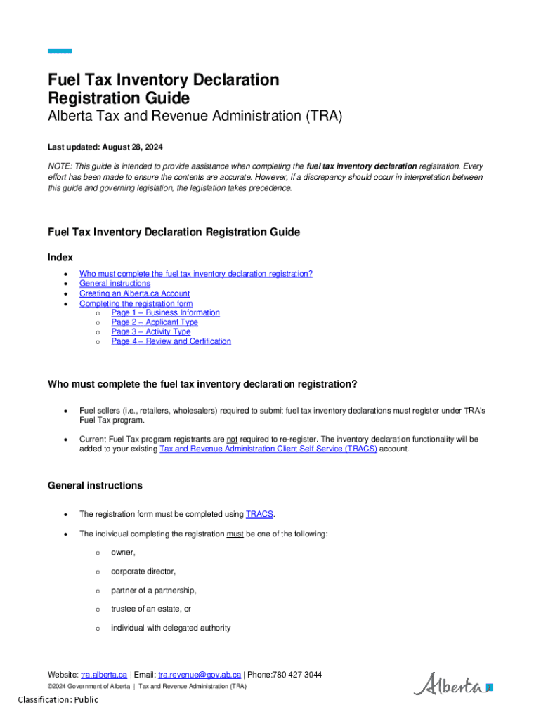 Fuel Tax Inventory Declaration Registration Guide Alberta Tax and Revenue Administration (ERA) Last updated: August 28, 2024, NOTE: This guide is intended to provide assistance when completing the