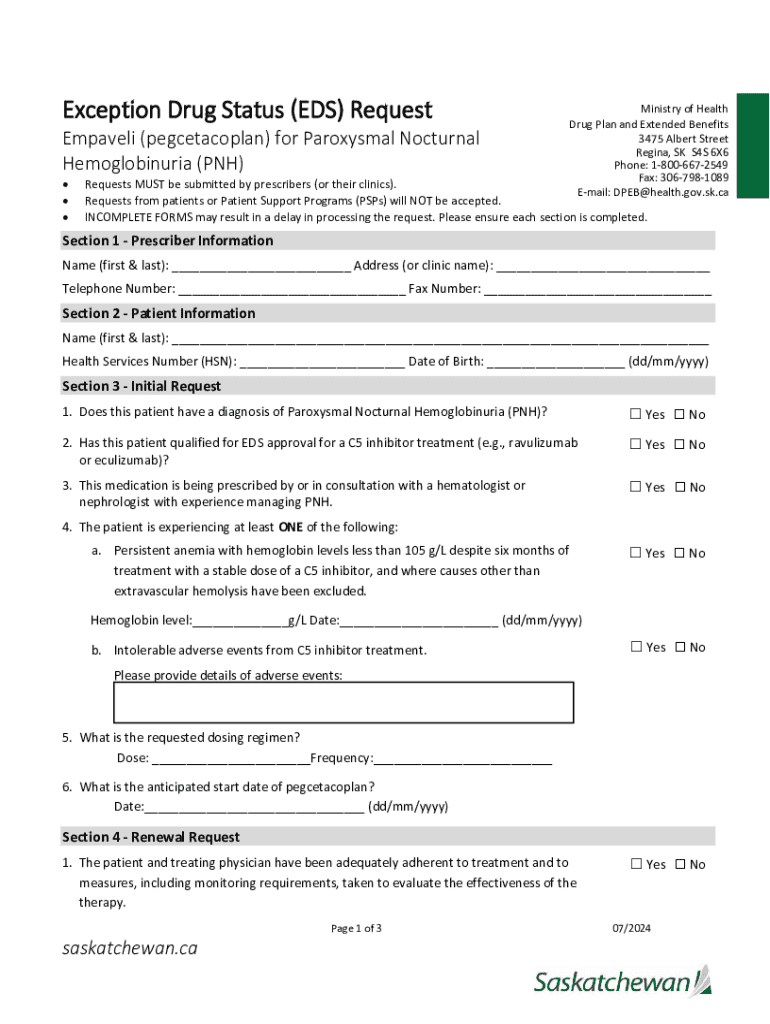 Exception Drug Status (EDS) Request Empanel (pegcetacoplan) for Paroxysmal Nocturnal Hemoglobinuria (PNH) Ministry of Health Drug Plan and Extended Benefits 3475 Albert Street Regina, SK S4S 6×6