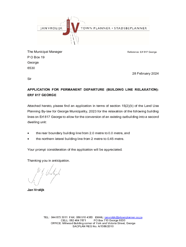 This document details an application for permanent building line relaxation on Erf 817 George to convert an outbuilding into a second dwelling unit, ensuring compliance with municipal regulations.