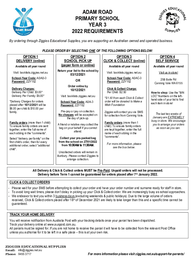 Discover the 2022 Year 3 requirements for Adam Road Primary School, including purchasing options and delivery details from Ziggies Educational Supplies.