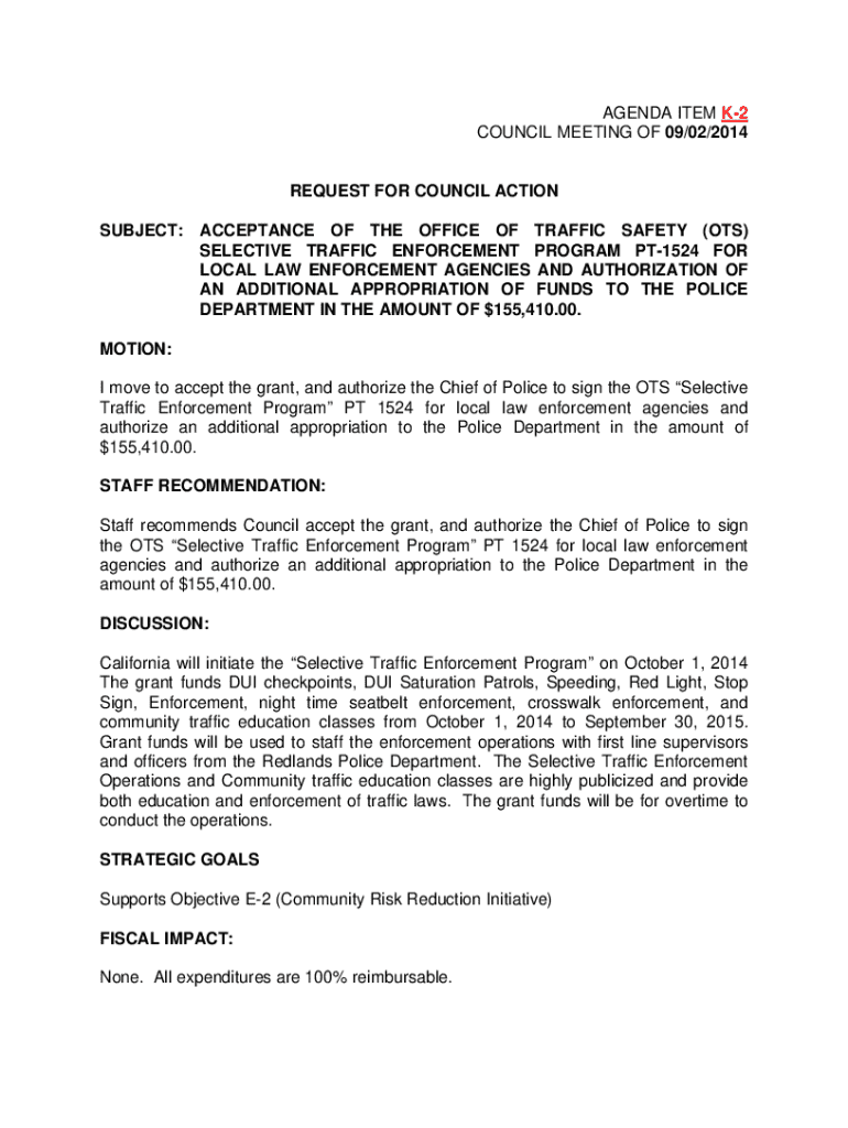 AGENDA ITEM K2 COUNCIL MEETING OF 09/02/2014REQUEST FOR COUNCIL ACTION SUBJECT:ACCEPTANCE OF THE OFFICE OF TRAFFIC SAFETY (ITS) SELECTIVE TRAFFIC ENFORCEMENT PROGRAM PT1524 FOR LOCAL LAW ENFORCEMENT