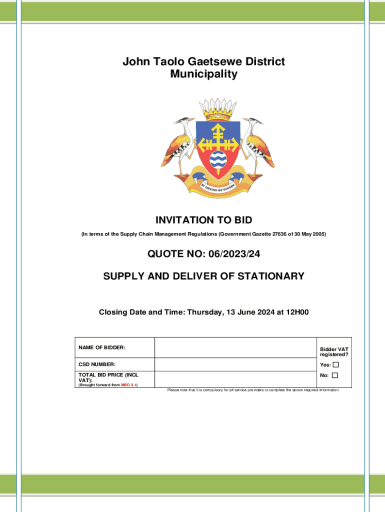 John Tao lo Pantsuit District MunicipalityINVITATION TO BID (In terms of the Supply Chain Management Regulations (Government Gazette 27636 of 30 May 2005)QUOTE NO: 06/2023/24 SUPPLY AND DELIVER OF
