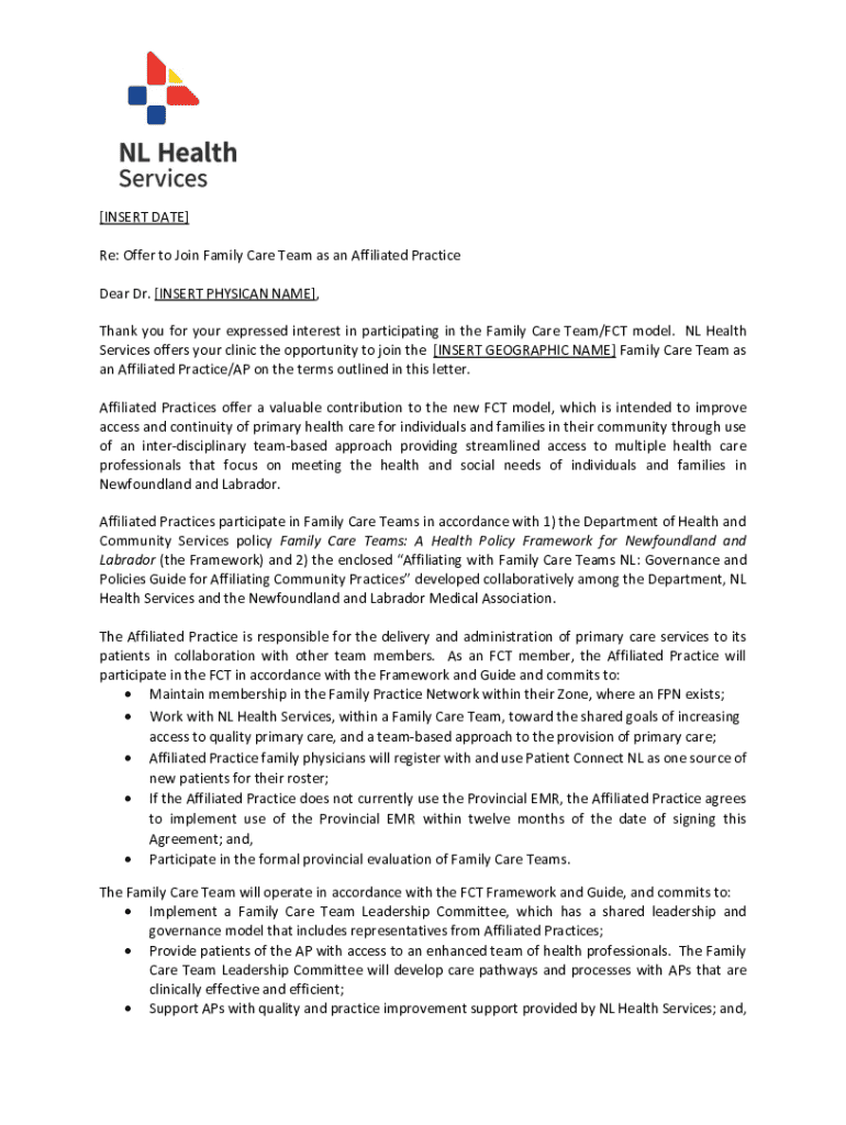 [INSERT DATE] Re: Offer to Join Family Care Team as an Affiliated Practice Dear Dr. [INSERT PHYSICAL NAME], Thank you for your expressed interest in participating in the Family Care Team/ACT model.