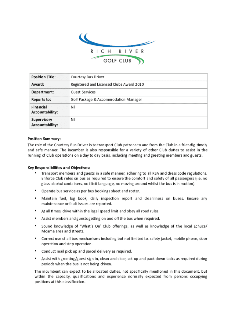 Position Title:Courtesy Bus DriverAward:Registered and Licensed Clubs Award 2010Department:Guest ServicesReports to:Golf Package & Accommoda9on ManagerFinancial Accountability:Supervisory Accountability:NilPosi%on