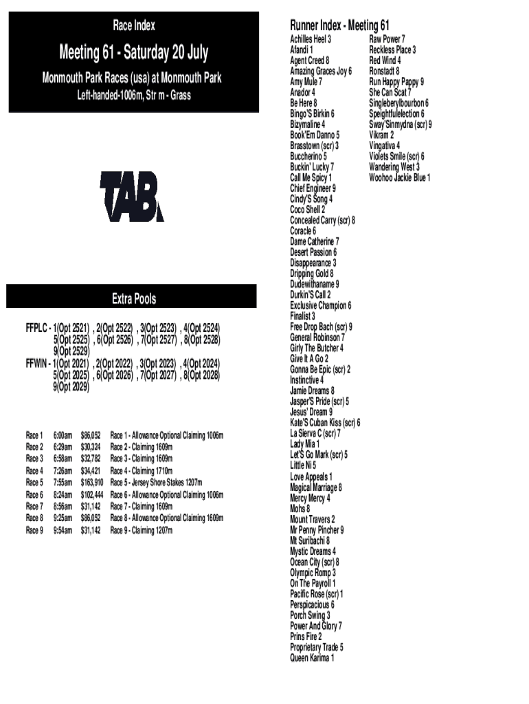 Race IndexMeeting 61 Saturday 20 July Monmouth Park Races (usa) at Monmouth Park Lefthanded1006m, Str m GrassExtra Pools FFPLC 1(Opt 2521) 5(Opt 2525) 9(Opt 2529) FFWIN 1(Opt 2021) 5(Opt 2025) 9(Opt