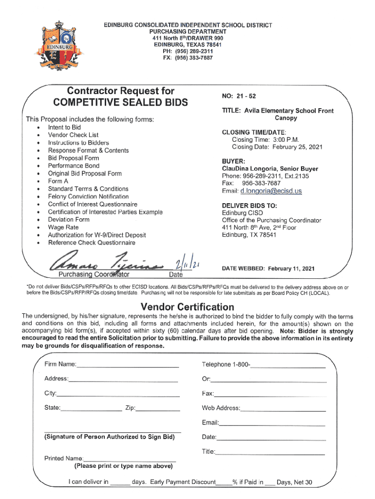 PEDINBURG CONSOLIDATED INDEPENDENT SCHOOL DISTRICT PURCHASING DEPARTMENT 411 North 8th/DRAWER 990 EDINBURG, TEXAS 78541 PH: (956) 2892311 FX: (956) 3837687Contractor Request for COMPETITIVE SEALED