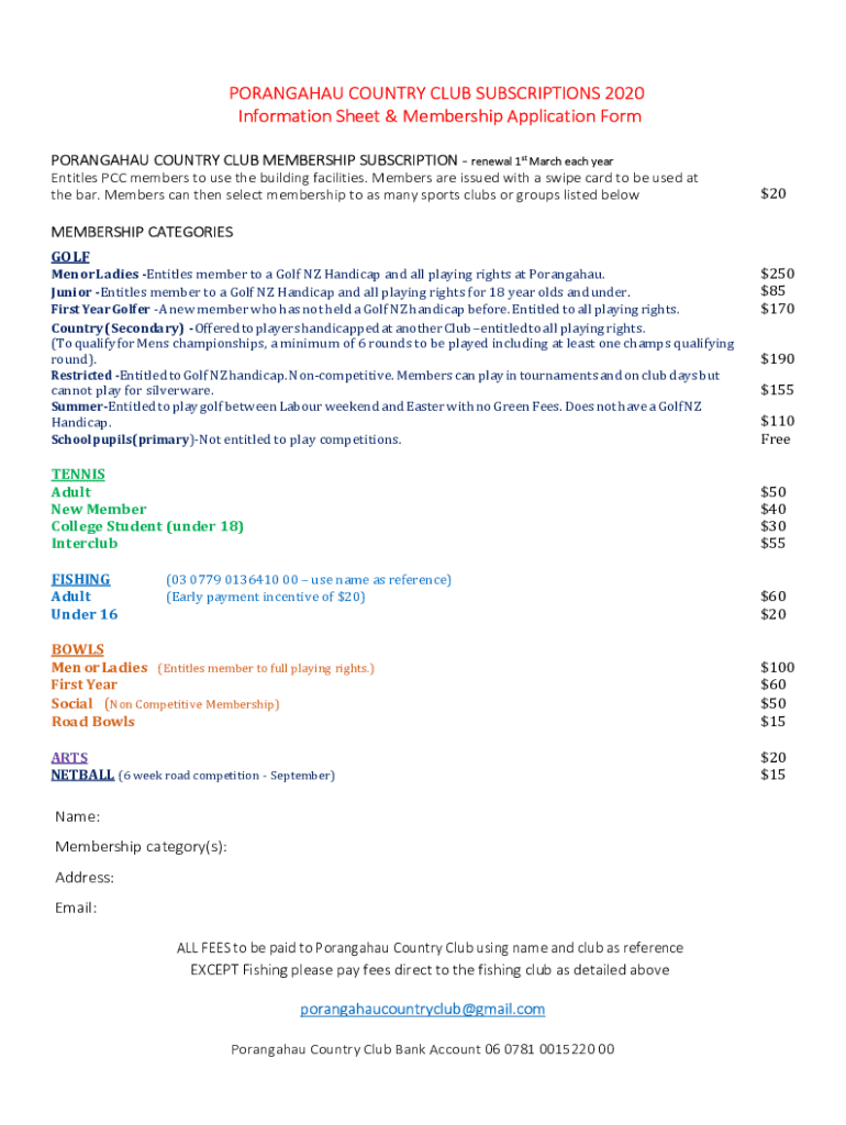 PORANGAHAU COUNTRY CLUB SUBSCRIPTIONS 2020