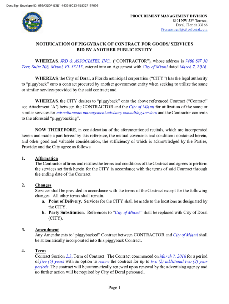 DocuSign Envelope ID: 586A3D0FE3E14433BC231E5327167506PROCUREMENT MANAGEMENT DIVISION 8401 NW 53rd Terrace, , Florida 33166 Procurement@cityofdoral.comNOTIFICATION OF PIGGYBACK OF CONTRACT FOR GOODS/