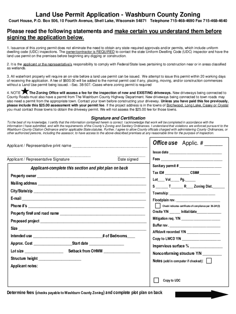 Land Use Permit Application Washburn County Zoning Court House, P.O. Box 506, 10 Fourth Avenue, Shell Lake, Wisconsin 54871 Telephone 7154684690 Fax 7154684640Please read the following statements
