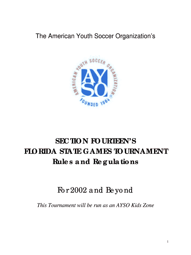 The American Youth Soccer Organizations SECTION FOURTEENS FLORIDA STATE GAMES TOURNAMENT Rules and Regulations For 2002 and Beyond This Tournament will be run as and ALSO Kids Zone 1 Voted and approved