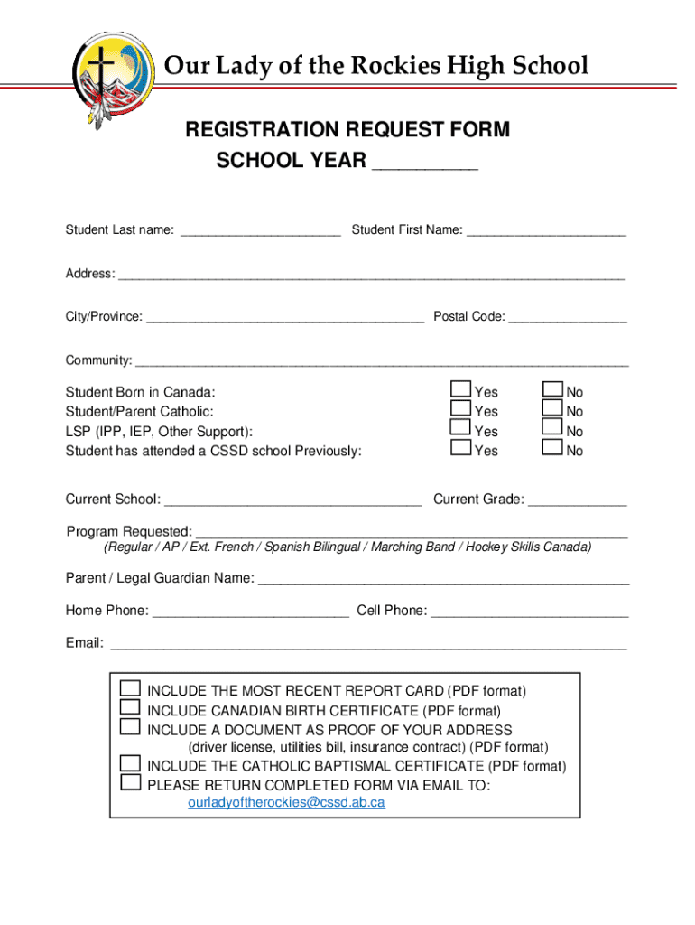 Our Lady of the Rockies High School REGISTRATION REQUEST FORM SCHOOL YEAR ___Student Last name: ___ Student First Name: ___ Address: ___ City/Province: ___ Postal Code: ___ Community: ___Student Born