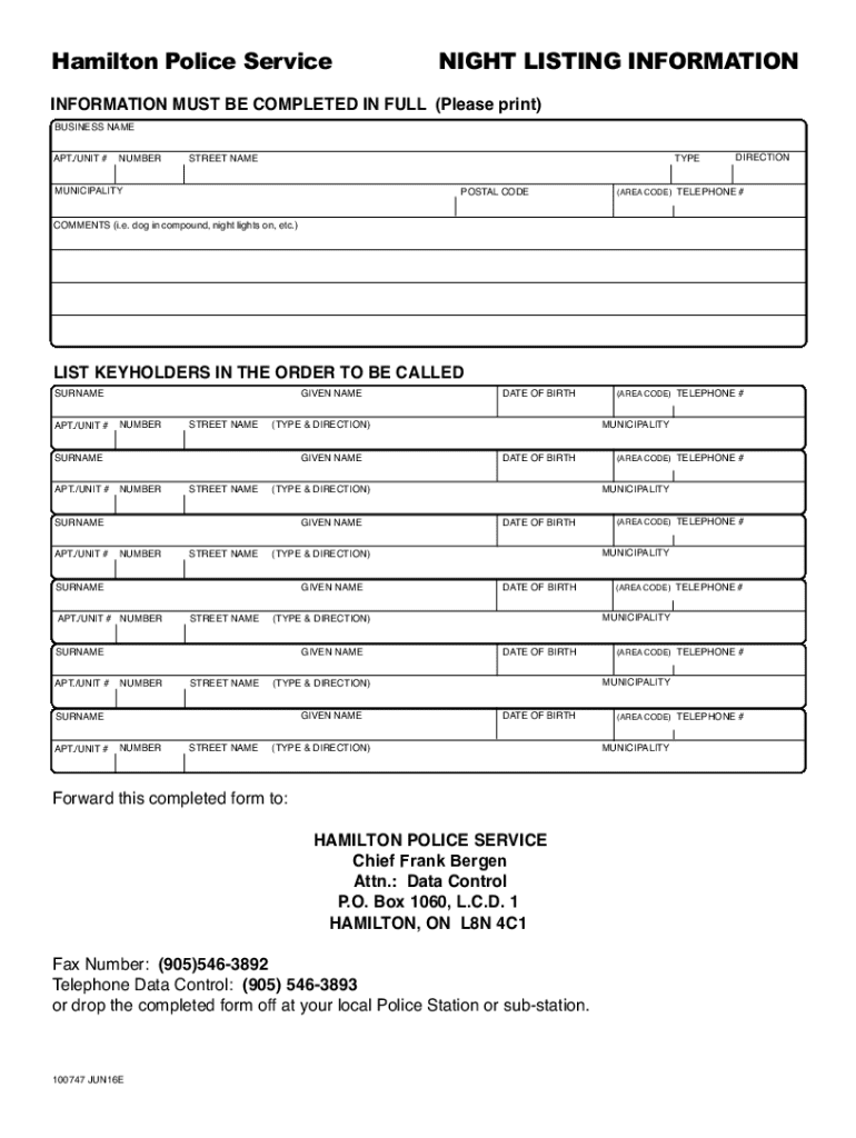 Get the free Night Listing Information Form - hamiltonpolice on