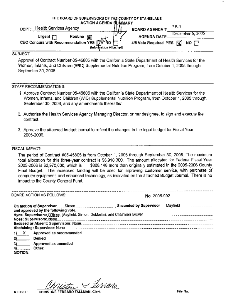 THE BOARD OF SUPERVISORS OF THE COUNTY STANISLAUS ACTION AGENDA BOARD AGENDA #\”B3 December 6,2005AGENDA DATE 415 Vote Required YESaNOSUBJECT:Approval of Contract Number 0545805 with the California