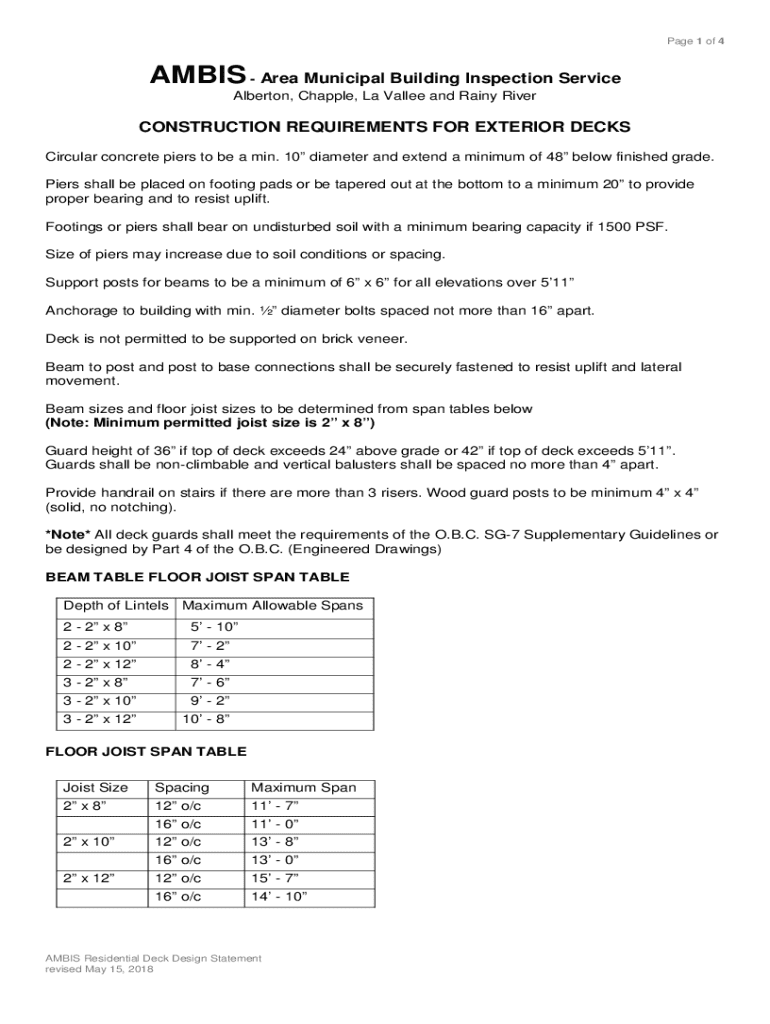 Page 1 of 4AMBIS Area Municipal Building Inspection Service Alberton, Chapple, La Vallee and Rainy RiverCONSTRUCTION REQUIREMENTS FOR EXTERIOR DECKS Circular concrete piers to be a min. 10 diameter