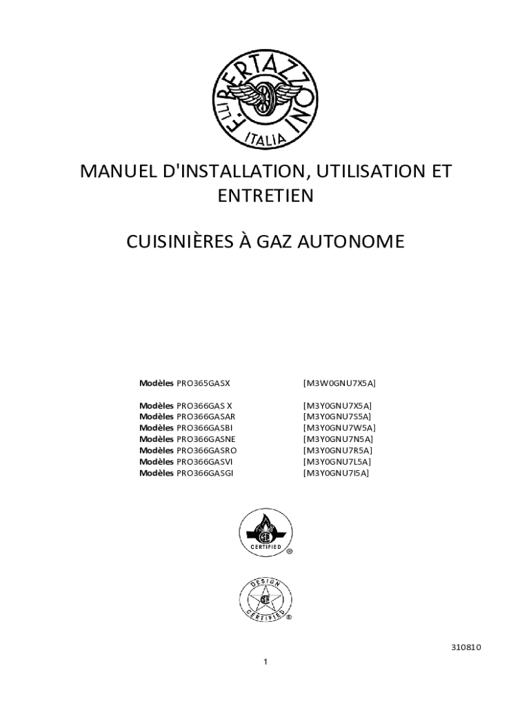 MANUEL D\'INSTALLATION, UTILISATION ET ENTRETIEN CUISINIRES GAZ AUTONOMEModles PRO365GASX[M3W0GNU7X5A]Modles PRO366GAS X Modles PRO366GASAR Modles PRO366GASBI Modles PRO366GASNE Modles PRO366GASRO
